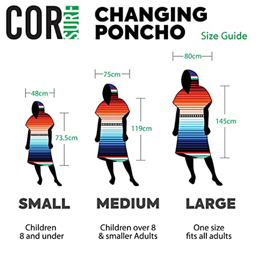 Spezifikationen der Cor Surf-Poncho-Handtücher: passend für kleine Erwachsene und große Kinder; (S) 73,7 x 48,3 cm; (M) 91,4 x 64,8 cm; (L) 104,1 x 88,9 cm.