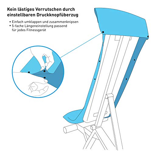 Een van de meest functionele handdoeken ter wereld. Op de fitness-handdoek zijn enkele drukknopen bevestigd. Door de drukknopen vast te zetten kan een capuchon gemaakt worden: de handdoek kan daardoor over de rugleuning van elk fitnessapparaat worden gehangen zonder eraf te glijden. De Fitness-handdoek heeft 6 verschillende lengte-instellingen en kan bovendien ook op zijn grootst (125 cm) nog met ca. 30 cm (kleinere sporthanddoek) worden verlengd.