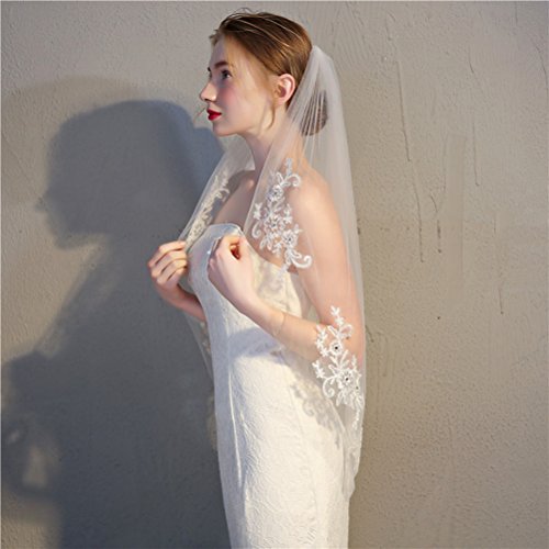 1 x eenvoudige en elegante kristallen kralen korte bruidssluier met kanten appliques (off-white)