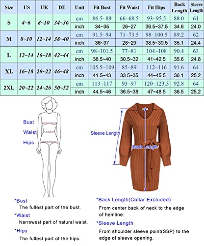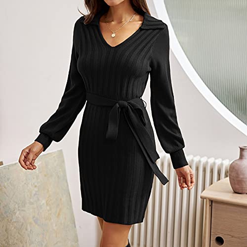GRACE KARIN CL399A21 Trui-jurk met lange mouwen en omslagkraag, gebreide jurk met V-hals, etui-jurk met riem